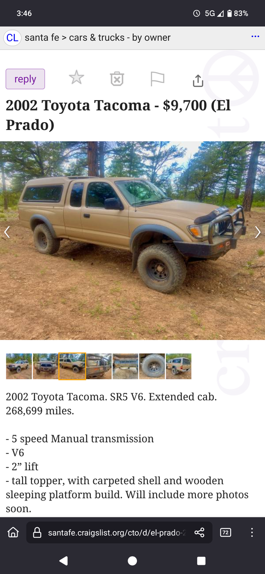 She was right in my backyard, a hour and a half to my north. Everything I was looking for, with an offroad bumper to boot. The price was a little high for the mileage, but the listing seemed almost too good to be true.