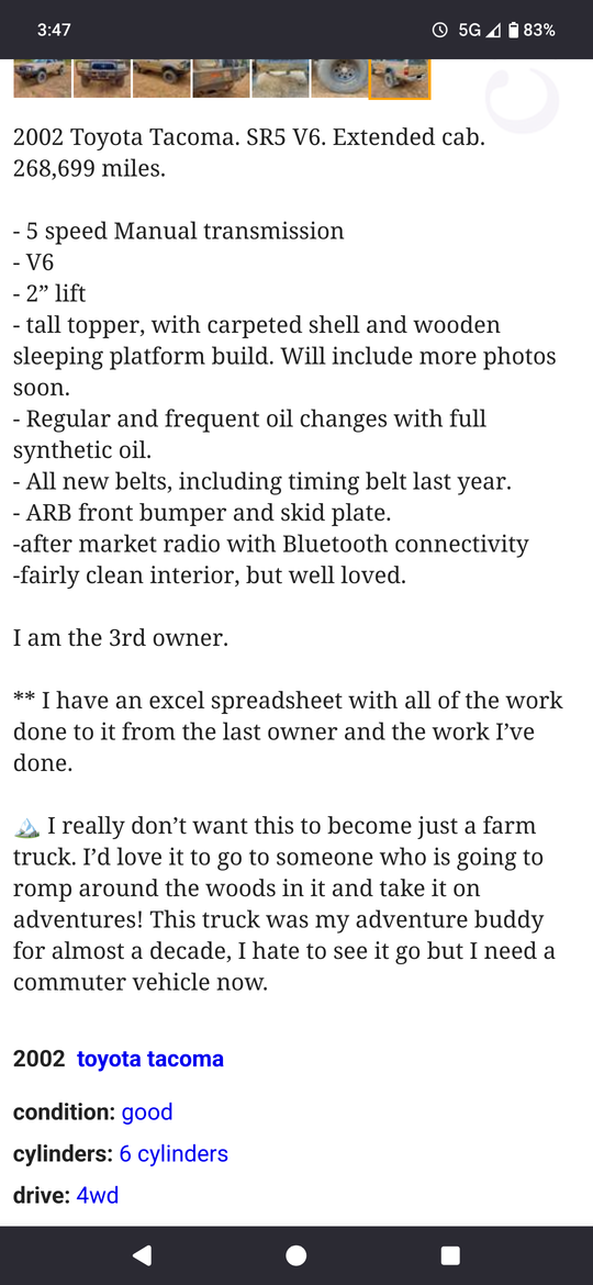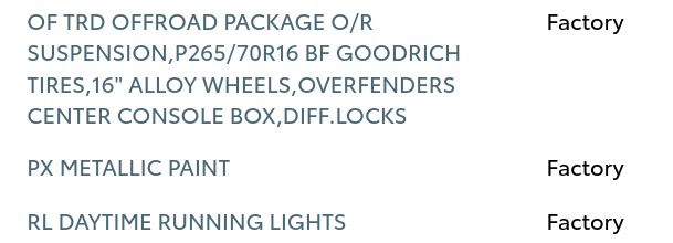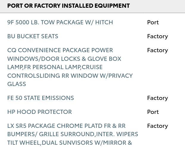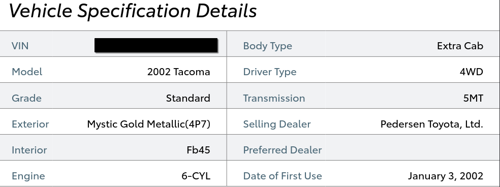 I promptly listed and sold my Honda for $5,500, which was about $2,000 more than I was expecting to get for her. I also found out how to look up the Toyota manufacturing specs for my truck and realized just how much of a unicorn I had found.